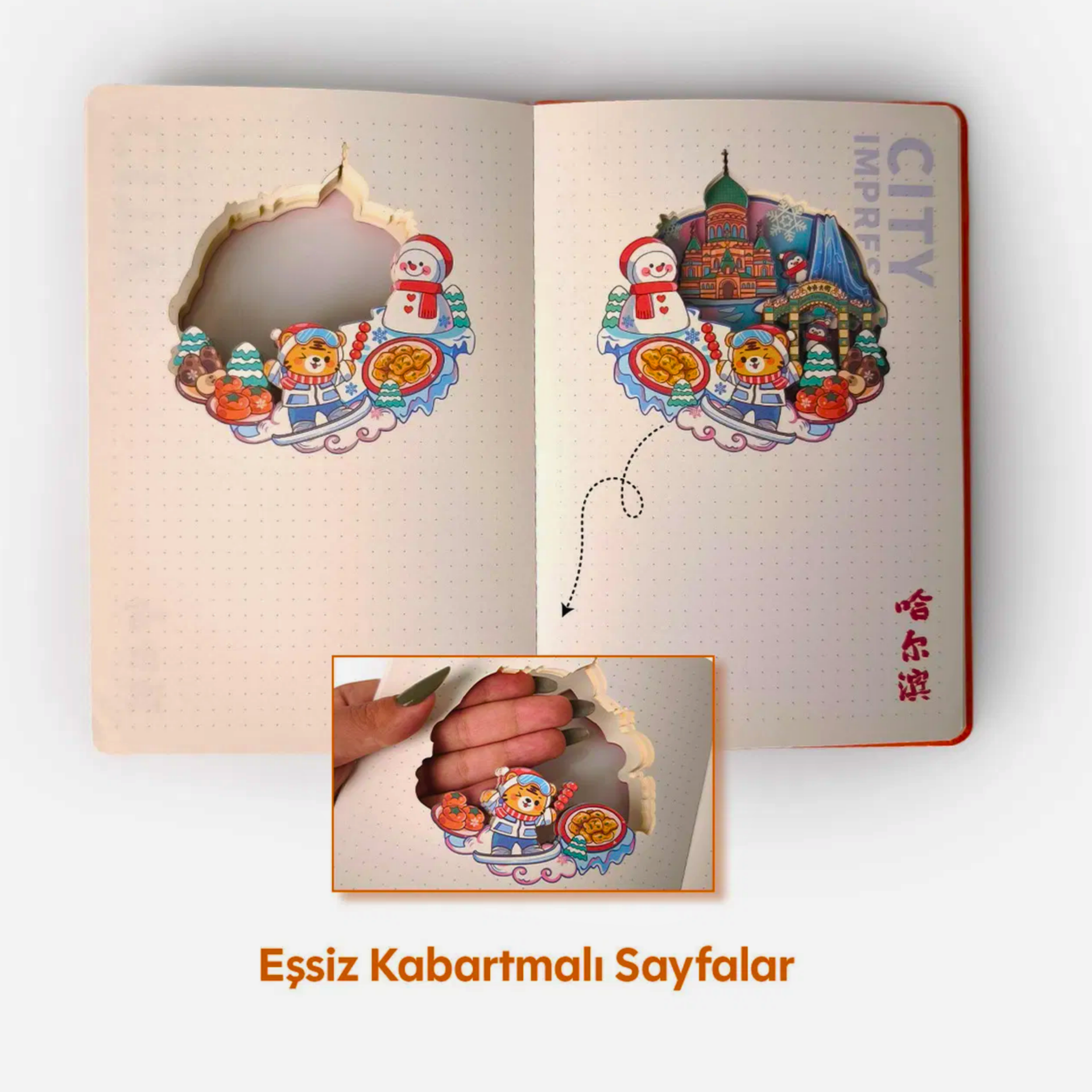 Modern üretim teknikleriyle tasarlanan 3D lazer kesimli defter, klasik defterlerden farklı olarak katmanlı ve derinlik hissi veren özel bir kapak yapısına sahiptir. Üzerindeki lazer kesim pencere detayı, iç sayfadaki 3D illüstrasyonla bütünleşerek deftere özgün ve premium bir karakter kazandırır.