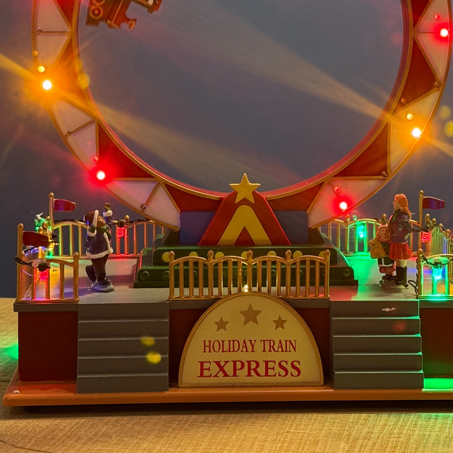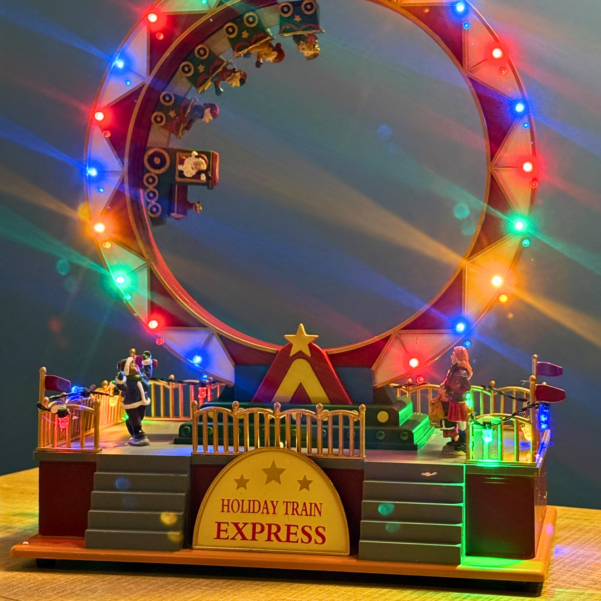 Tren, çemberin etrafında 360° dönerken renkli LED ışıklar sırayla yanar ve ürün aynı zamanda yılbaşı müzikleri çalar. “Holiday Train Express” platformu, minyatür ziyaretçiler, Noel Baba ve çevresel detaylarla birlikte oldukça gösterişli bir sahne sunar.