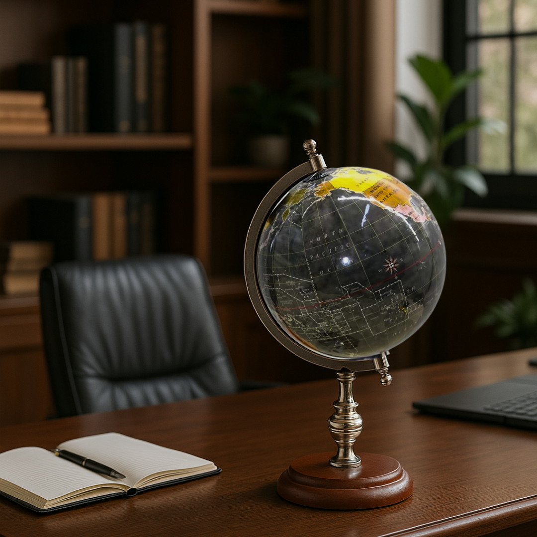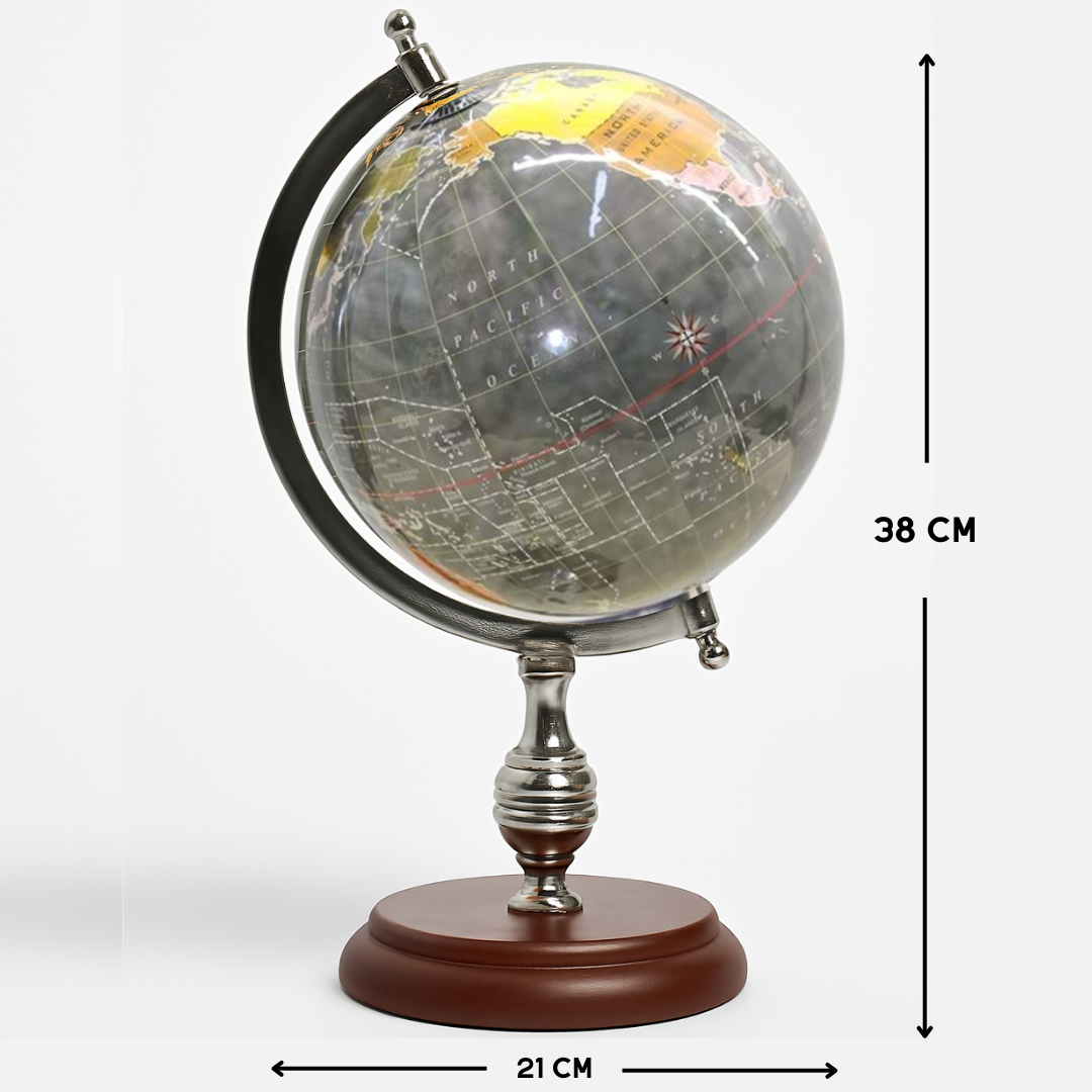 Koyu tonlarda tasarlanmış detaylı haritası, zarif metal ayak ve kaliteli ahşap tabanla birleşerek hem klasik hem modern dekorlara uyum sağlar.