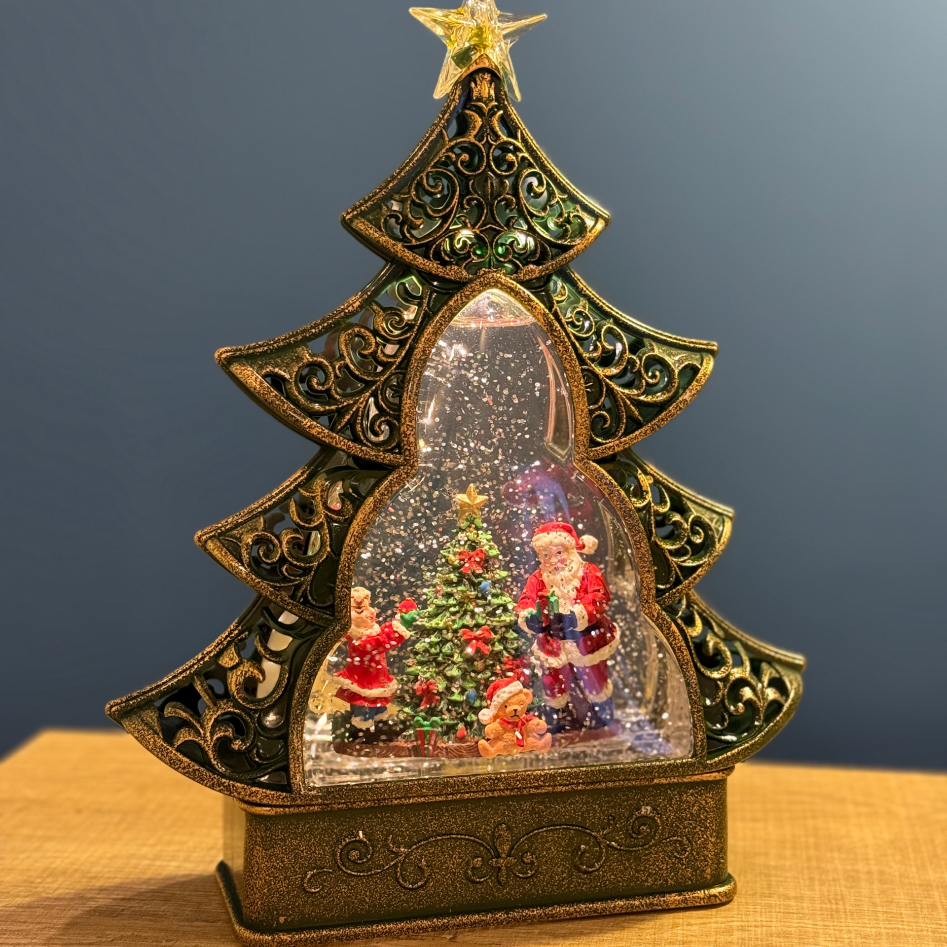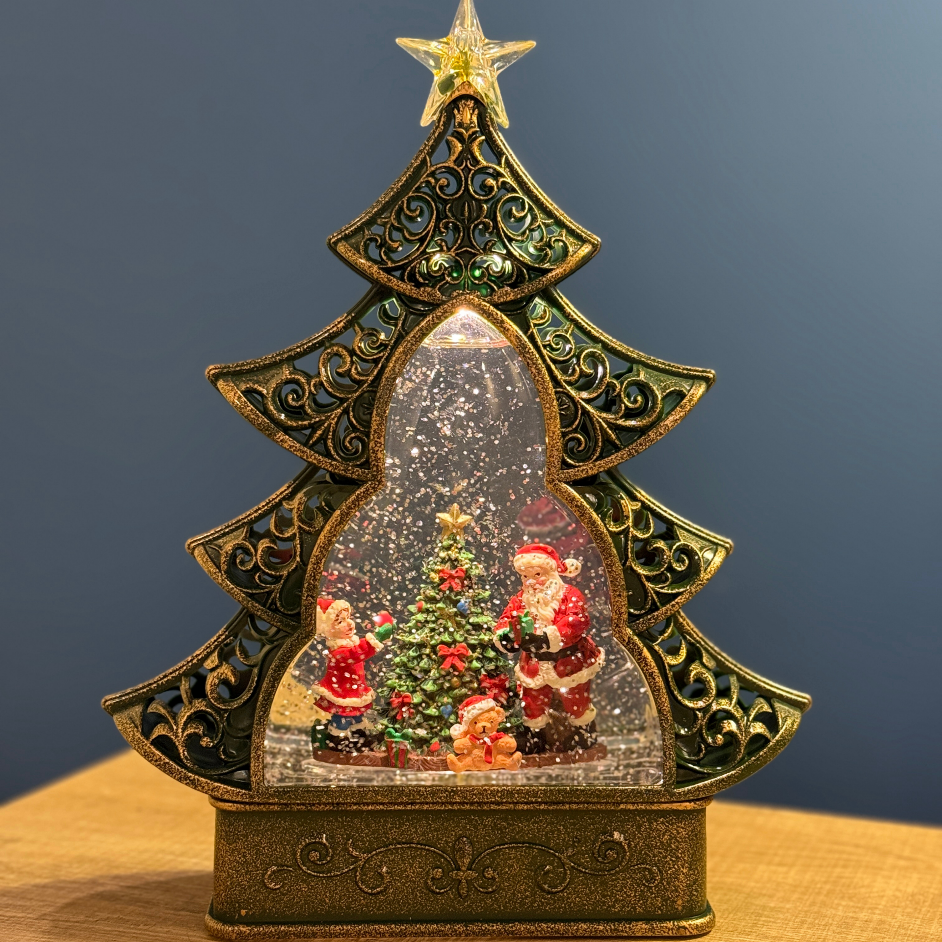 Zarif çam ağacı formu, işlemeli dış gövdesi ve iç kısmında yer alan Noel Baba, çocuk figürleri ve süslenmiş yılbaşı ağacı ile bu kar küresi, yılbaşı dekorasyonunuza masalsı bir dokunuş katar. İç haznesindeki parlak simli kar efektleri, LED ışıklarla birlikte etkileyici bir görsel şölen oluşturur.