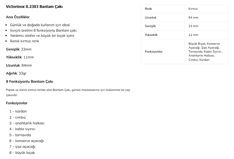 Victorinox 0.2303 Bantam, İsviçre üretimi orijinal Swiss Army çakı serisinin kompakt bir temsilcisidir. Aşağıdaki özelliklerle öne çıkar: