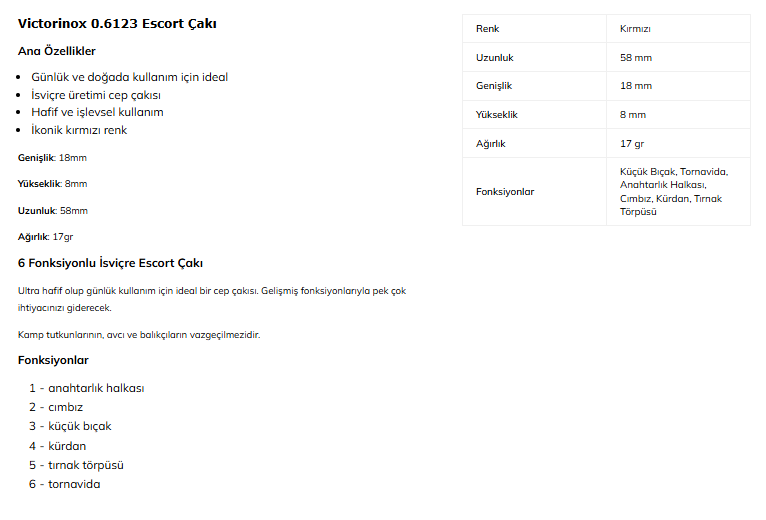 Victorinox 0.6123 Escort, İsviçre üretimi klasik bir cep çakısıdır.