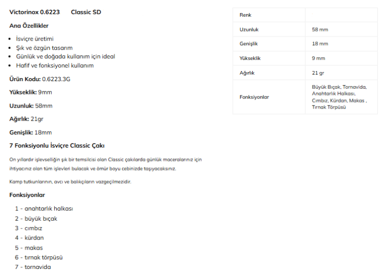 Fonksiyonlar: Ana bıçak, makas, tırnak törpüsü (uça tornavida ucu), cımbız, kürdan, anahtarlık halkası