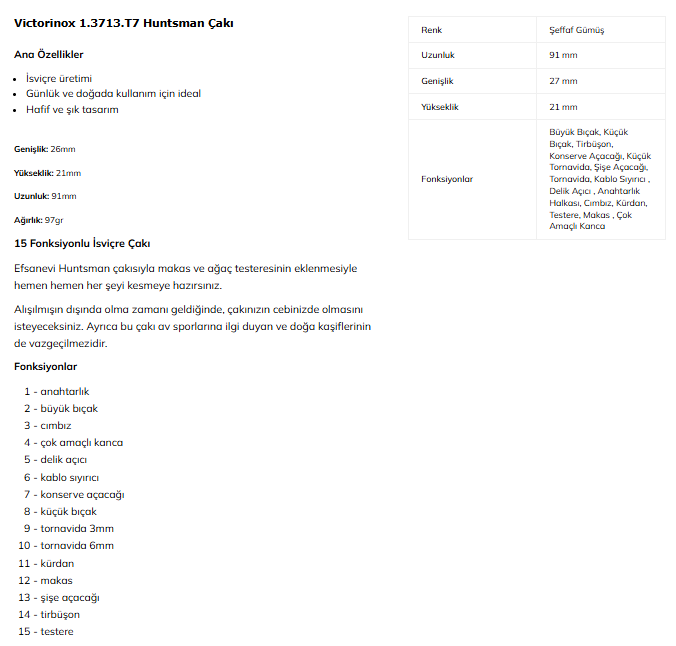 15 Fonksiyon: Büyük bıçak, küçük bıçak, makas, ahşap testere, konserve açacağı (küçük tornavida uçlu), şişe açacağı (6 mm tornavida uçlu), tel sıyırıcı, çok amaçlı kanca, zımba / oyucu, tırnak törpüsü / tornavida ucu, cımbız, kürdan, anahtarlık halkası vb.