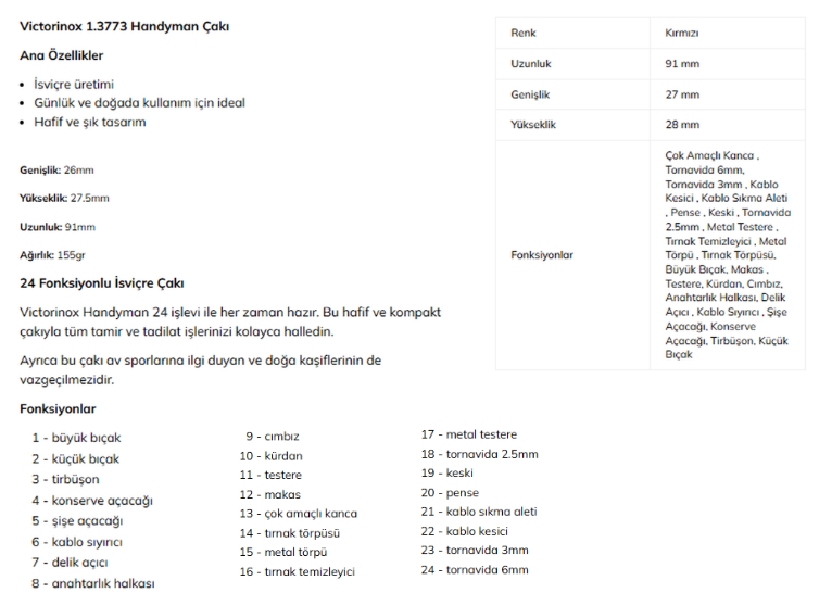 Victorinox 1.3773 Handyman, İsviçre üretimi çok fonksiyonlu bir şakı modelidir.