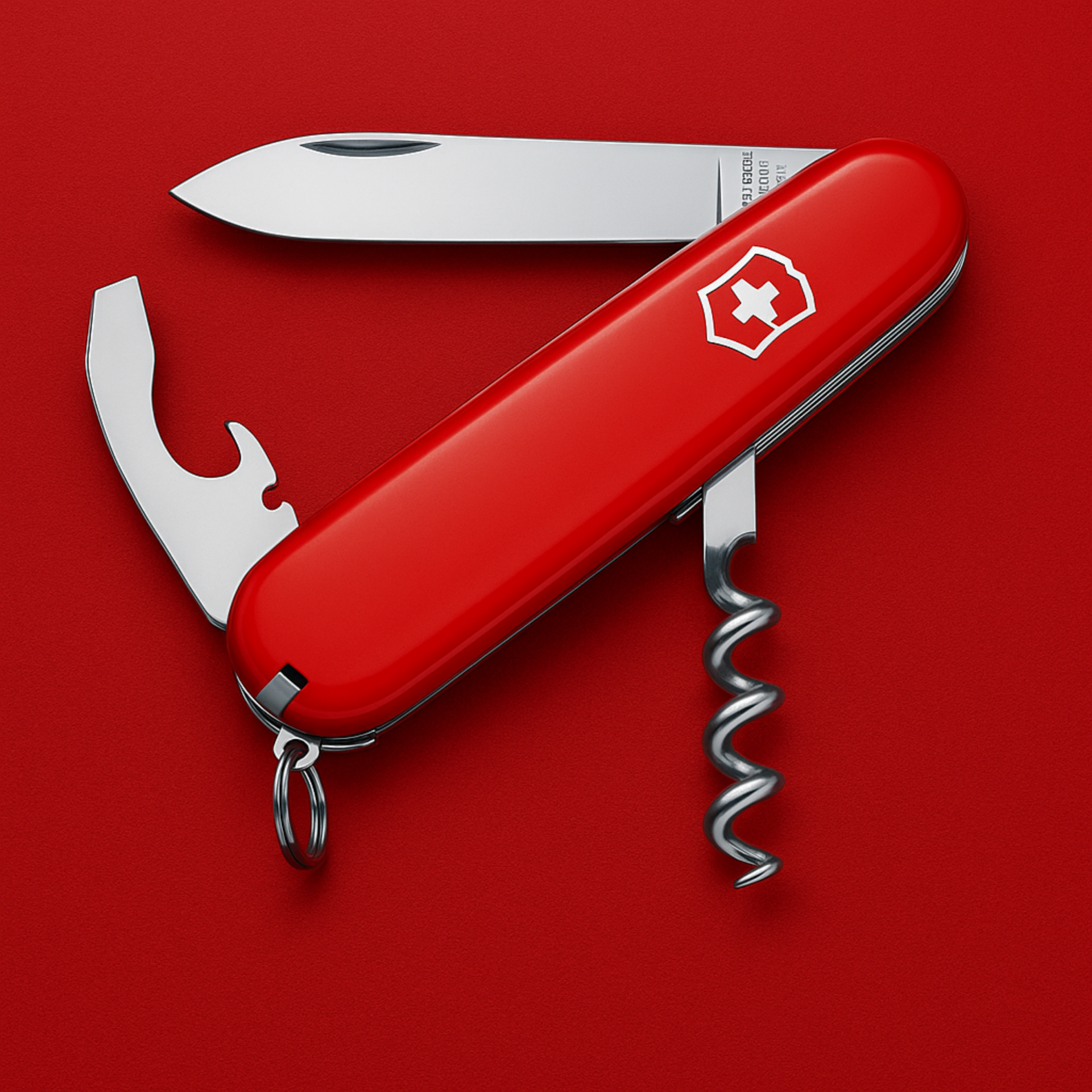 Victorinox Waiter (kalem kodu 0.3303) modeli, 9 farklı işlevi bir arada sunan Swiss Made cep çakısıdır. Özellikleri arasında büyük bıçak, mantar açacağı (corkscrew), şişe açacağı, konserve açacağı, 5 mm tornavida, tel sıyırma aparatı, kürdan, cımbız ve anahtarlık halkası bulunur.